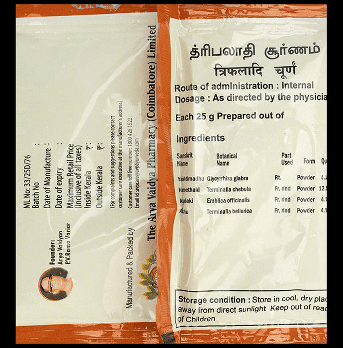 AVP Thriphaladi Chooranam is a blend of powerful ayurvedic herbs - amalaki, haritaki, and Vibhitaki. The ayurvedic herb haritaki improves the appetite and is a natural laxative, while vibhitaki regulates digestive functions. This choornam has yashtimadhu which is a liquorice and is known in Ayurveda to have a positive effect on eye health. This choornam enhances the digestive and metabolic process which in turn improves the visual functions.