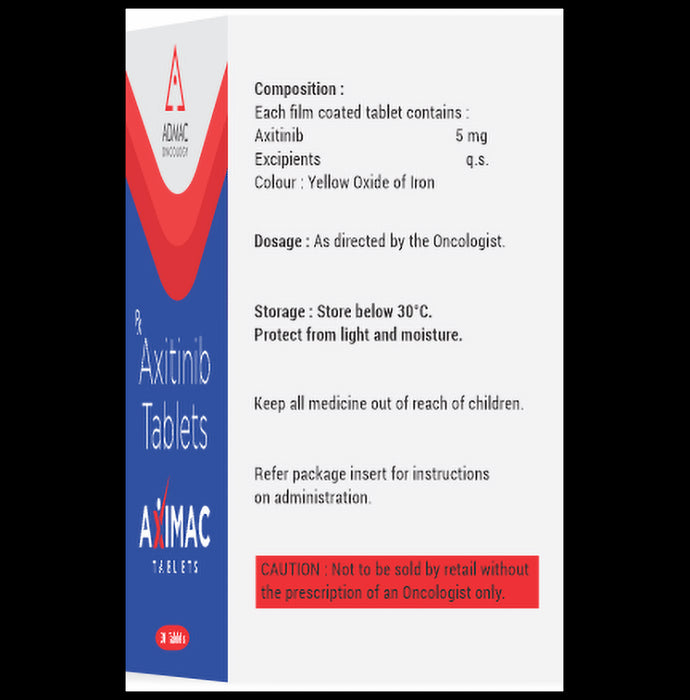 Aximac Tablet is an anti-cancer medicine used in the treatment of kidney cancer. Aximac Tablet can be taken with or without food, but try to have it at the same time every day to get the most benefits. Your doctor will decide what dose is necessary and how often you need to take it. This will depend on what you are being treated for and may change from time to time. You should take it exactly as your doctor has advised. Taking it in the wrong way or taking too much can cause very serious side effects. It may take several weeks or months for you to see or feel the benefits but do not stop taking it unless your doctor tells you to.The most common side effects of this medicine include high blood pressure, joint pain, and loss of appetite. Diarrhea, shortness of breath, can be serious sometimes so take medicine to treat it as prescribed by the doctor or stay hydrated. Your doctor may advise for regular blood pressure checkups while you are taking this medicine. Inform your doctor if you notice a severe headache, confusion, problems with your eyesight, nausea or vomiting.Before taking it, tell your doctor if you have thyroid problems, liver or bleeding problems or are taking any medicines to treat infections. Many other medicines can affect, or be affected by, this medicine so let your healthcare team know all medications you are using. This medicine is not recommended during pregnancy or while breastfeeding. The use of effective contraception by females during treatment is important to avoid pregnancy.