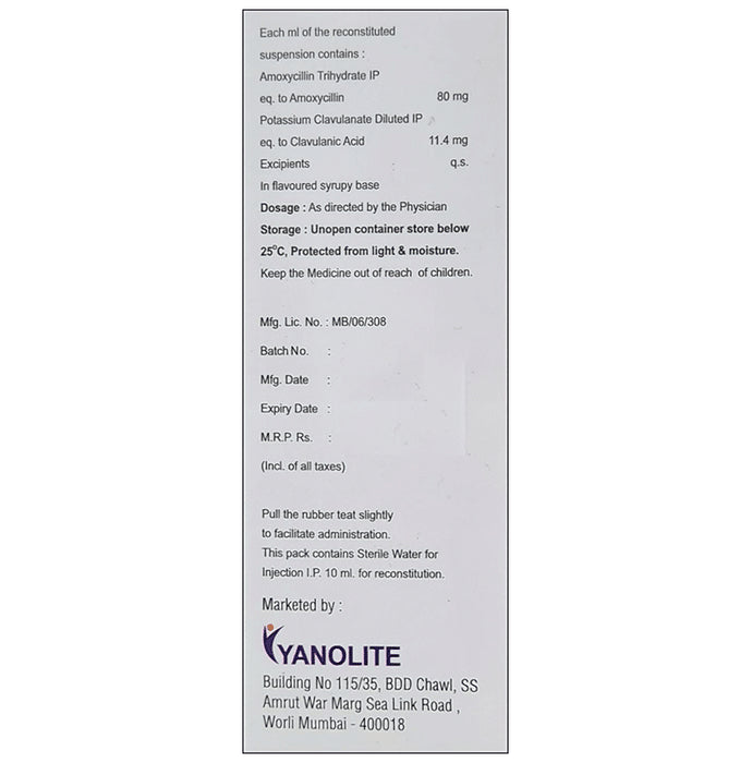 Composition : Amoxycillin (80mg) + Clavulanic Acid (11.4mg)