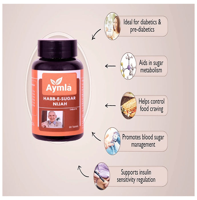 Aymla Habb-E-Sugar Nijah Tablet These herbs have hypoglycemic, anti-high blood sugar, and insulin-regulating qualities, they may help lower blood sugar levels. Stops the weakenedeffects of high blood sugar. This aids in controlling blood sugar levels. Perfect for older adults with high blood sugar Additionally aids in controlling weight, frequency of urine, etc.