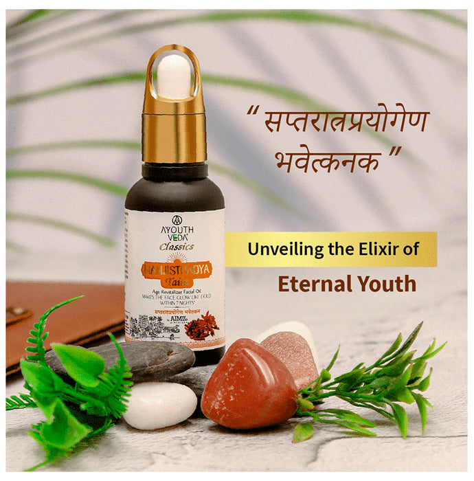 Ayouth Veda Classics Manjisthdya Taila is an age revitalizer, is a glow-boosting facial oil made with varnya dravya, complexion enhancer herbs, as mentioned in ancient text. This oil makes skin look more youthful and noticeably allays visible signs of ageing.