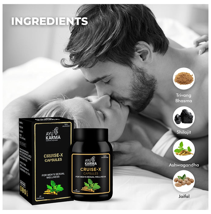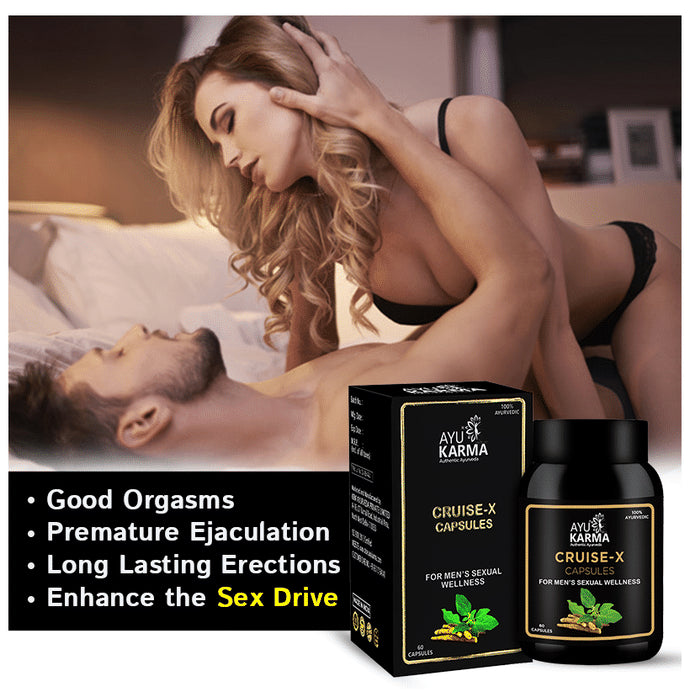 Ayukarma Cruise-X Capsule (60 Each)is an Ayurvedic capsule for men that enhances performance, strength, vigour and vitality. It improves sexual wellness and reduces premature ejaculation and erectile dysfunction.