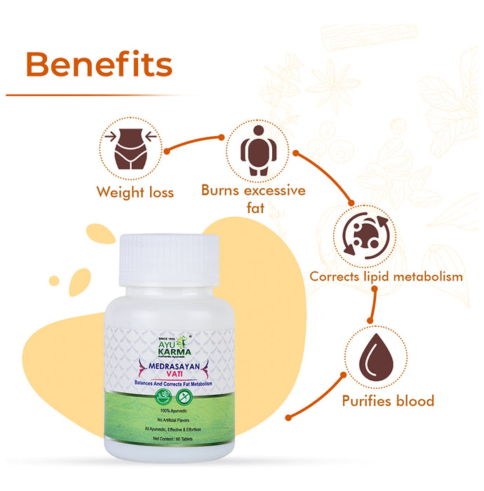 Ayukarma Medrasayan Vati helps in weight loss and acts as a body fat cutter which helps to reduce weight naturally. Metabolism is improved with these tablets. It may act on the urogenital system by removing extra debris and helping strengthen it. It has antibacterial properties that may help in the reduction of water retention and may help control urinary tract infections.