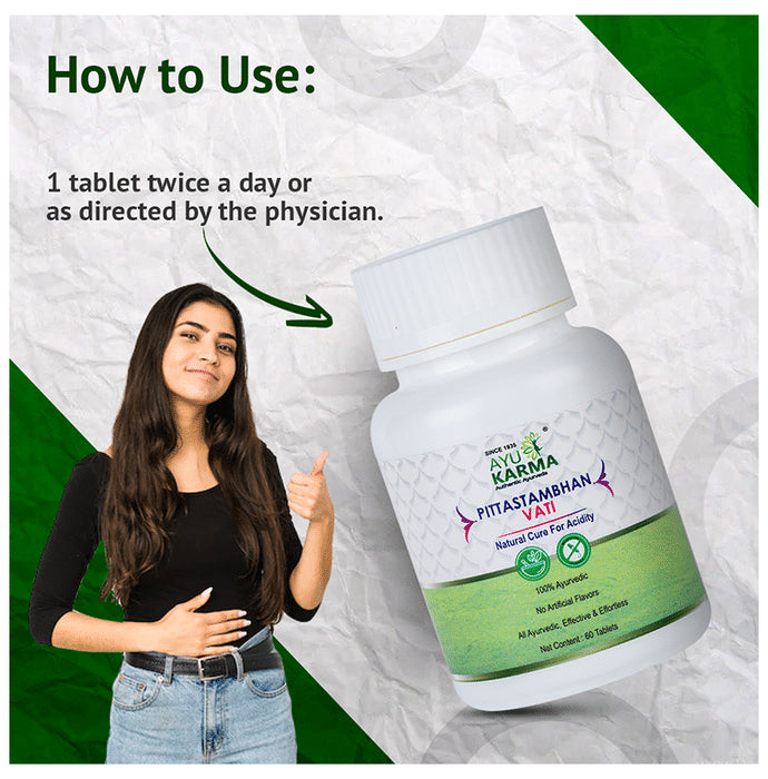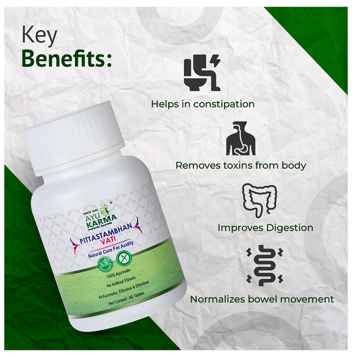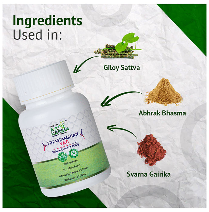 Ayukarma Pittastambhan Vati (60 Each) is an Ayurvedic tablet that is a natural cure for acidity. It is free from artificial flavours and provides effective relief from stomach ailments.