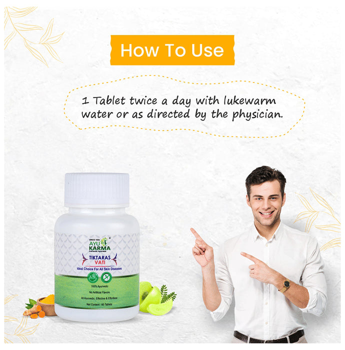 Ayukarma Tiktaras Vati is used to boost immunity and protect you from various infections. It is a supplement that is also known to help you fight against respiratory problems and improve the symptoms of cough and cold. It is also known to aid in the quick recovery of a person post an illness. In addition to that, its herbal properties help to treat indigestion and other stomach woes.