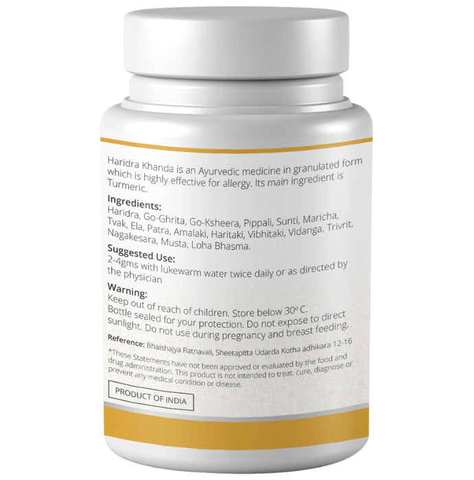 Ayuna Haridra Khanda is a uniquely formulated ayurvedic powder with anti-allergic properties. It helps to relieve skin ailments and reduce itching. It helps with hives, boils and allergic rhinitis. It is helpful in reducing the effects of diabetes on different body organs. It also has anti-inflammatory and antioxidant properties