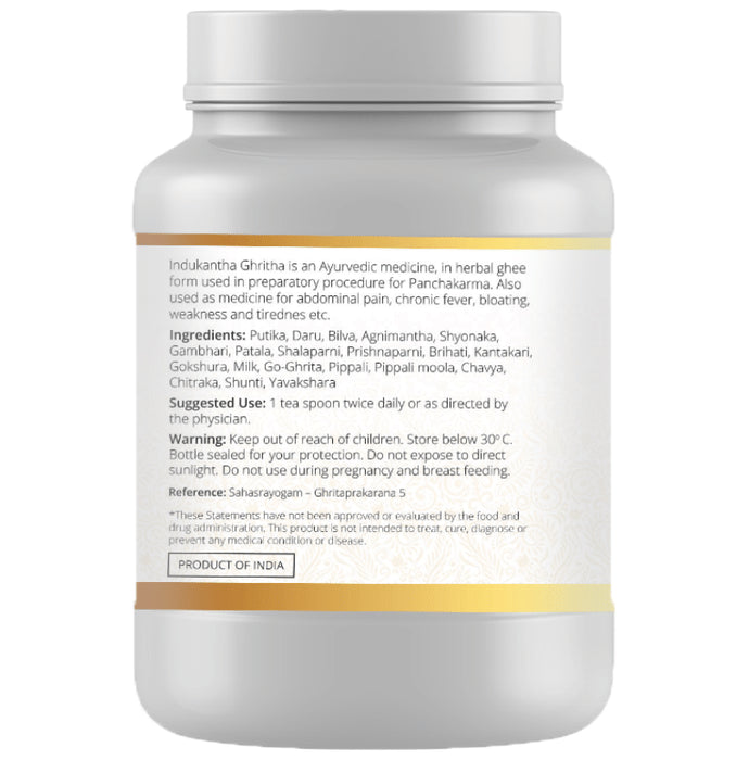 Ayuna Indukanta Ghritam is a specially formulated ayurvedic blend helpful in gastrointestinal diseases such as abdominal pain, bloating, indigestion etc. It helps with chronic fever and weakness and improves metabolism. It is also helpful for allergic conditions, coughs and cold.
