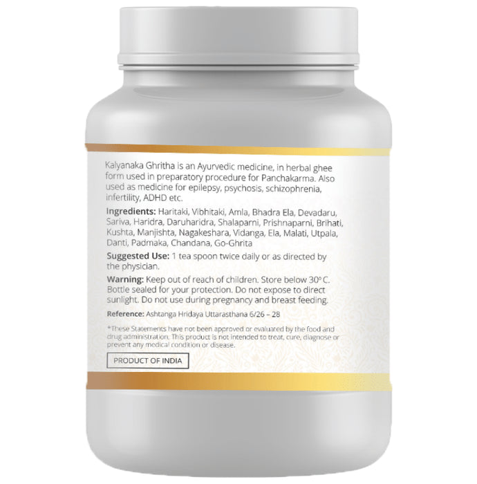 Ayuna Kalyanaka Ghritam is a herbal dietary supplement helpful for diseases like anaemia, cough, epilepsy and psychosis. It helps to reduce inflammation of the joints. It is effective for fever, cough and vomiting. It also helps with piles, and ADHD and may help to improve male and female reproductive health.