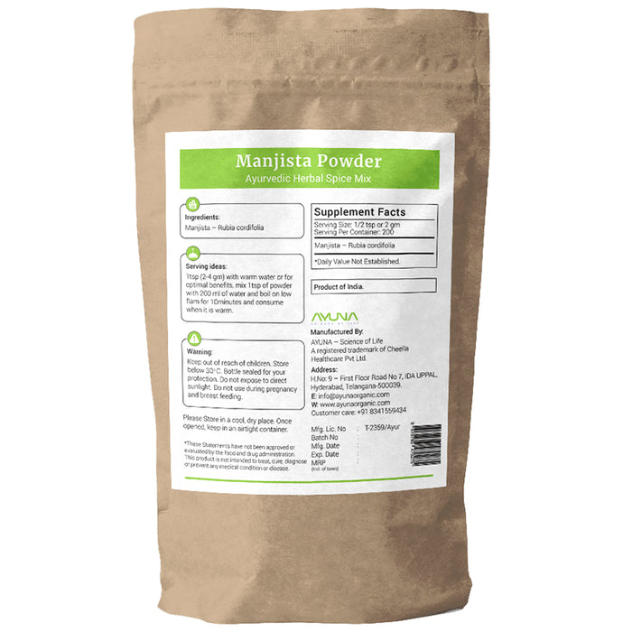 Ayuna Manjista Powder is a herbal product which acts as a blood purifier and helps in healthy liver functioning. It protects cardiovascular health and manages blood sugar levels. Its antioxidant, antibacterial and anti-inflammatory properties help with various skin issues. It is also found to play a role in wound healing.