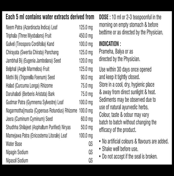 Composition : Neem Patra Leat,Triphala Fruit,Gulvel Kand,Chirayata Panchang,Jambhul Bi Sed,Belphal Fruit,Methi Bij Seed,Halad Rhizome,Daruhaladi Berberis Aristata Bark,Gudmar Patra Leaf, Nagamotta/musta (c)porous Rotonds Ritene, Jeera, Sesd, Shuta Staest Lfsgpretn Puted, Mamejawa Patra Led, Water Base, Nipagin Sodium, Nipasol Sodium