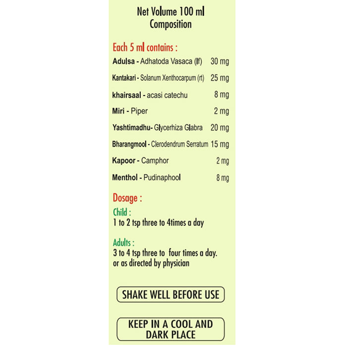 Composition : Each 5 ml contains:Adulsa - Adhatoda Vasaca (If) 30 mg,Kantakari - Solanum Xenthocarpum (rt) 25 mg,Khairsaal - acasi catechu 8 mg,Miri - Piper 2 mg,Yashtimadhu- Glycerhiza Glabra 20 mg,Bharangmool - Clerodendrum Serratum 15 mg,Kapoor - Camphor 2 mg,Menthol - Pudinaphool 8 mg