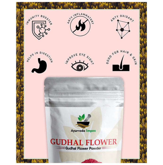 Ayurveda Impex Gudhal Flower PowderAyurveda Impex Gudhal Flower Powder is rich in antioxidants that can help in preventing ageing symptoms and cancer. Hibiscus Rosa Sinensis popularly known as guildhall in North India is a flower having medicinal value and is used in Ayurveda for the same.