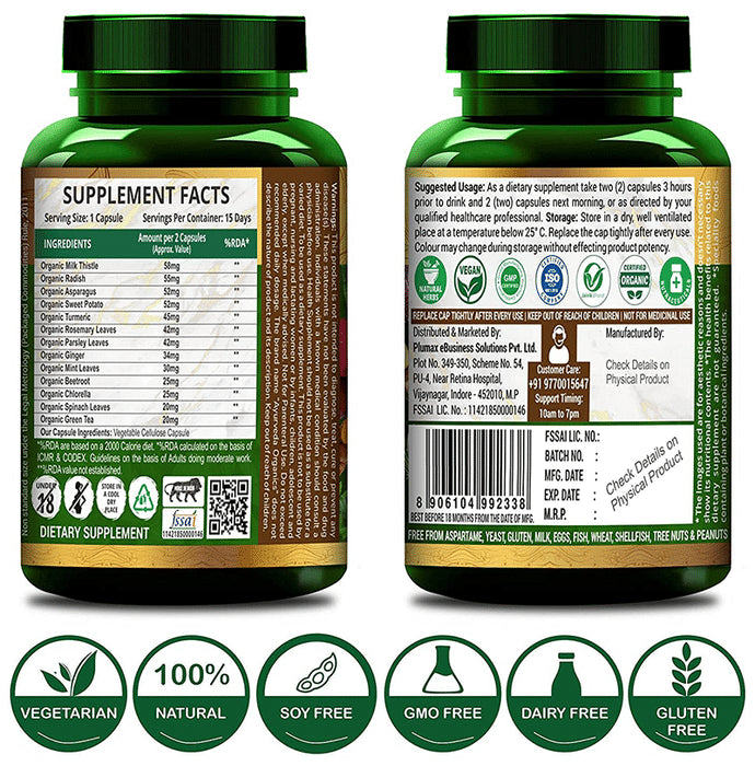 Ayurveda Organics Plant-Based Hangover Shield Vegetarian Capsule is a comprehensive formulation of organically sourced herbs that can effectively manage hangover and its related ailments. It can help remove acetaldehyde from the body, a hangover causing toxin, and it may provide relief from hangover symptoms such as dizziness, fatigue, headache, anxiety and nausea.