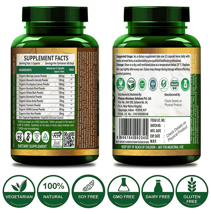 Composition : Turmeric,Moringa,Boswellia serrata,Organic moringa leaves powder,Organic boswellia serrata powder,Organic eucalyptus leaves powder,Organic burdock root powder,Organic willow bark powder,Organic drumstick powder, Organic green amla powder,Organic turmeric powder,Organic alfalfa leaves powder,Organic aloe vera powder,