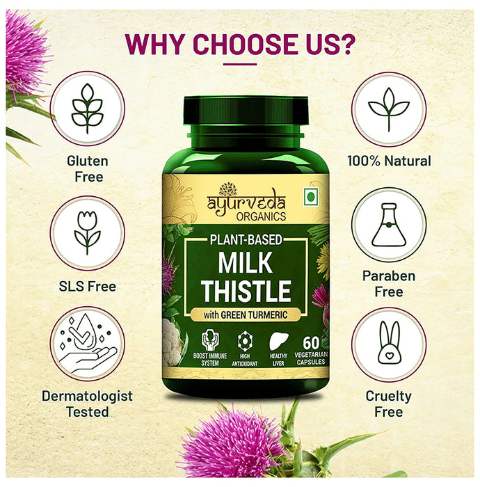 Ayurveda Organics Plant-Based Milk Thistle Vegetarian Capsule with Green Turmeric, primarily used to support liver health. With Milk Thistle as the primary ingredient, it helps detoxify the liver and removes impurities. Additionally, it promotes cellular health and contains anti-inflammatory and antioxidant properties, which help protect the body from the damage caused by free radicals.