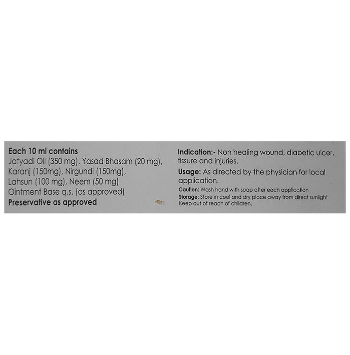 Composition : Each 10ml contains:Jatyadi Oil 350mg,Yasad Bhasam 20mg,Karanj 150mg,Nirgundi 150mg,Lahsun 100mg,Neem 50mg,Ointment Base q.s. (as approved),Preservative as approved
