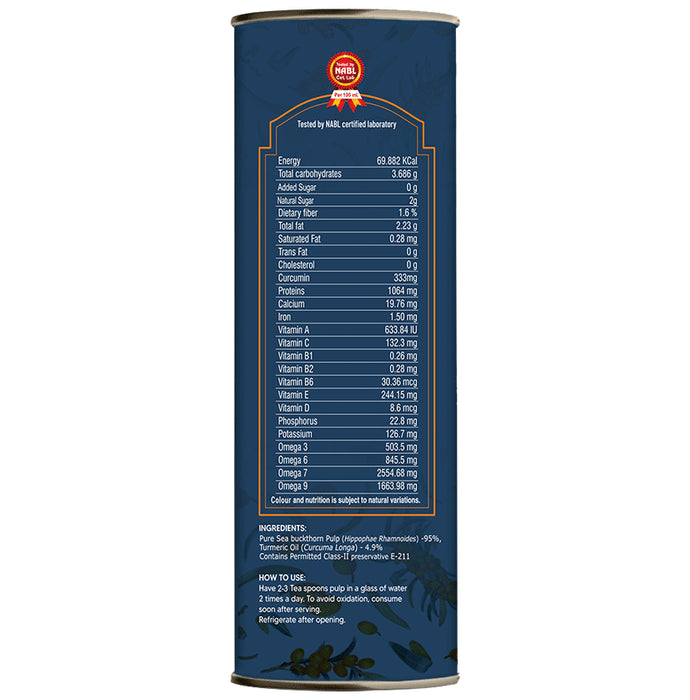 Composition : Pure Sea Buckthorn Pulp (Hippophae rhamnoides) - 95%,Turmeric Oil (Curcuma longa) - 4.9%
