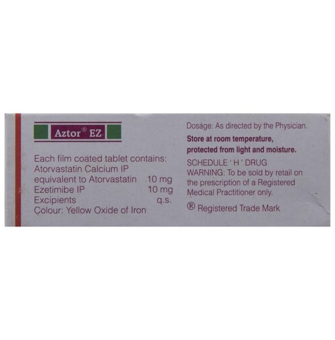 Aztor EZ Tablet is a medicine used to treat high cholesterol. It is a combination of two medicines that reduces '__'bad'__' cholesterol (LDL) and triglycerides (fats) levels. Aztor EZ Tablet can be taken with or without food. You should take it regularly at evenly spaced intervals as per the schedule prescribed by your doctor. Taking it at the same time every day will help you remember to take it. The dose and duration of treatment will depend on what you are being treated for. Do not stop taking it until you have finished the complete course, even when you feel better. You can help this medicine work better by making a few changes to your lifestyle such as keeping active, stopping smoking, eating a healthy low-fat diet and exercise regularly.Nausea, stomach pain, constipation, and muscle pain are some common side effects of this medicine. These are usually mild but let your doctor know if they bother you or last more than a few days. Let your doctor know if you notice yellowing of skin or eyes, unusually dark urine or dark stools as it might be symptoms of liver damage. You may be asked for regular monitoring of blood sugar level, and liver function while taking this medicine.Before taking this medicine, let your doctor know if you have any kidney or liver problems or high blood pressure. Pregnant or breastfeeding women should also consult their doctor before taking it. You should also let your healthcare team know all other medicines you are taking as they may affect, or be affected by this medicine.