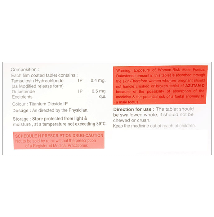 Azutam D Tablet MR is a combination of two medicines that work in different ways to treat men with an enlarged prostate gland. It helps to relieve symptoms such as difficulty urinating or needing to go to the toilet more often. It is not used to prevent prostate cancer. Azutam D Tablet MR may be taken with or without food but it should be taken at the same time each day. Your doctor will prescribe the dose most suitable for you. To gain the most benefit and to treat your symptoms effectively, you should not miss doses, even if you feel well. It may take up to 4 weeks to notice an improvement in the symptoms but keep taking them regularly. Tell your doctor if your symptoms do not improve after 4 weeks or if they get worse.The most common side effects of this medicine include impotence, decreased libido, breast pain, and ejaculation disorder. If these side effects worry you or do not go away, call your doctor for advice. You may also feel dizzy or drowsy. These risks are higher when you first start taking this drug. Remember, your doctor has given you this medicine because the benefits are greater than the risks of the side effects.Azutam D Tablet MR should not be taken by women or children. Before taking it, tell your doctor if you have low blood pressure or liver or kidney disease. This medicine may not be suitable. It can also affect, or be affected by, other drugs. So let your doctor know all the other medicines you are taking. You may be advised to wear a condom during sex if your partner is or may be pregnant. Your doctor may recommend getting your blood pressure checked frequently. Avoid drinking alcohol as it can cause excessive dizziness with this medicine.