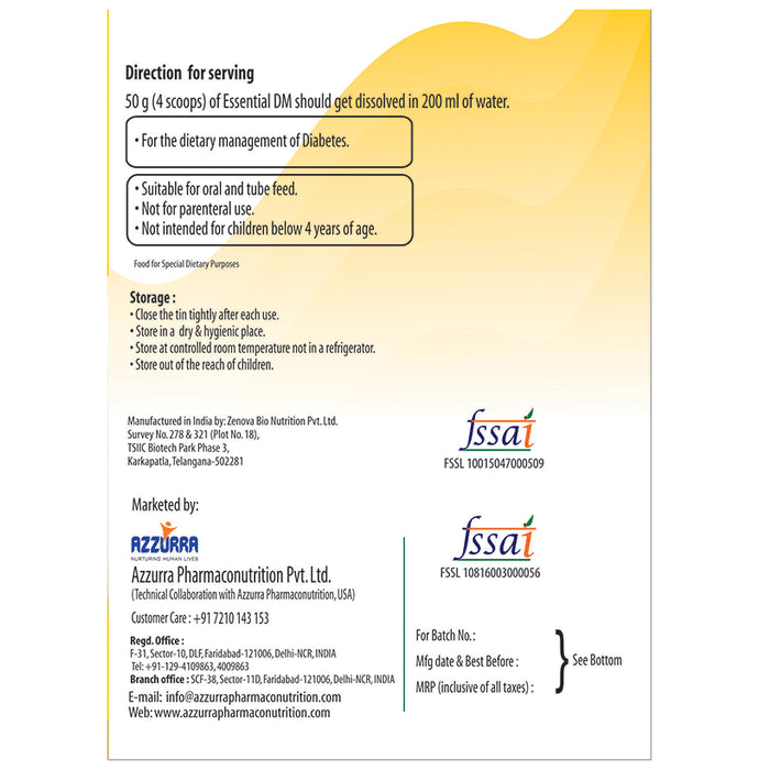 Azzurra Essential DM Powder Vanilla is rich in high biological value protein. It provides balanced meal replacement nutrition for diabetics. It is rich in alpha, lipoic acid, choline, Inositol, taurine & Carnitine. It is rich in MUFA, FOS and DHA and enriched with fibersol 2 and fenugreek fibre. It is ideal for oral and tube feed.