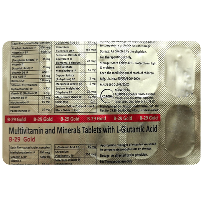 B 29 Gold Tablet is a nutritional supplement that is used to treat ailments resulting from nutritional deficiencies and decreased appetite. It is described as an important adjuvant for individuals who may require additional nutritional support.