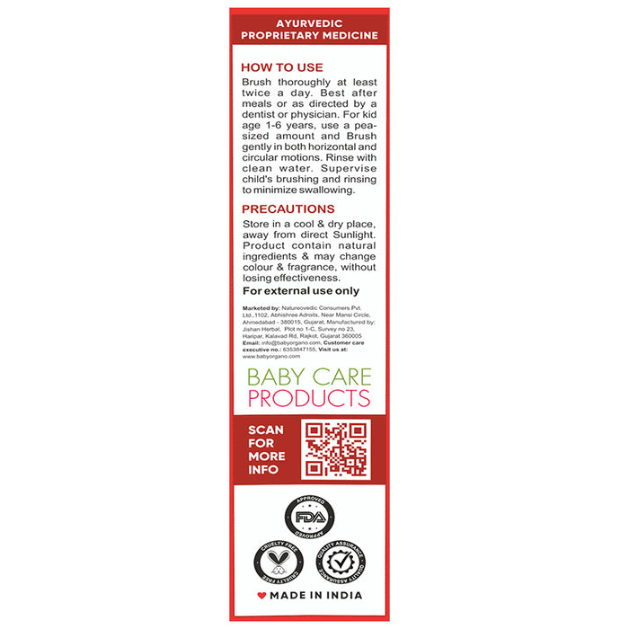 Baby Organo Combo Pack of Gentle Baby Wash 200gm, Nourishing Baby Lotion 200gm And Herbal Kids Toothpaste 50gmBaby Wash is helpful for the baby's soft and sensitive skin. It is a natural blend of hibiscus and aloe vera to moisturize and soothe the baby’s gentle skin. The tear-free formula makes a baby’s bathing experience playful and enjoyable. It does not contain any harsh ingredients like SLS, and Soap, which can make your baby’s skin dry and rough. Rather it contains natural, safe and ayurvedic ingredients. BabyOrgano gentle baby wash is a suitable choice for daily use. It is clinically tested for mildness and allergy. It is suitable for all skin types and for all kids.Nourishing Baby Lotion This baby lotion provides nourishment and moisturization . It makes your baby’s skin soft and smooth without being harsh. It has wheat germ oil and olive oil as one of its major ingredients, baby skin remains protected, hydrated and moisturised.Herbal Kids Toothpaste comes with the presence of Yashtimadhu (mulethi/licorice) which helps prevent cavities in the tooth, bad breath and gum inflammation. Its other active ingredients like Babool, neem and clove oil strengthen the teeth and helps prevent tooth decay. It has no added sugars, no chemicals and no harmful preservatives. Key IngredientsBaby Organo Gentle Baby Wash