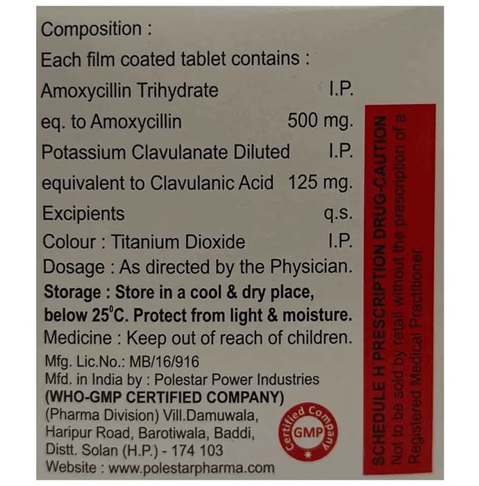 Composition : Amoxycillin (500mg) + Clavulanic Acid (125mg)