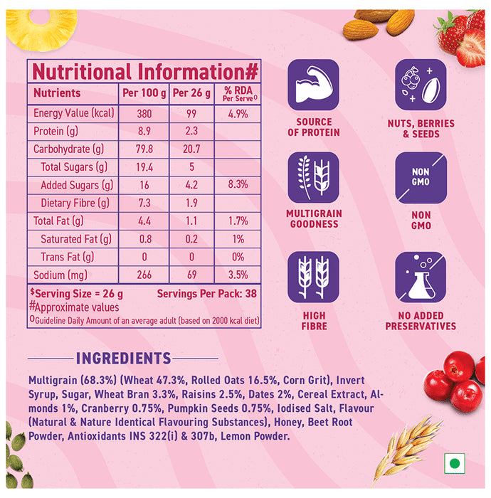 Composition : Multigrain,Rolled oats,Broken rolled wheat,Corn flakes,Nuts and raisins,Fruit crush,Wheat bran,Cranberry,Cereal extract,Pumpkin seeds,Honey,Beetroot powder,Lemon powder