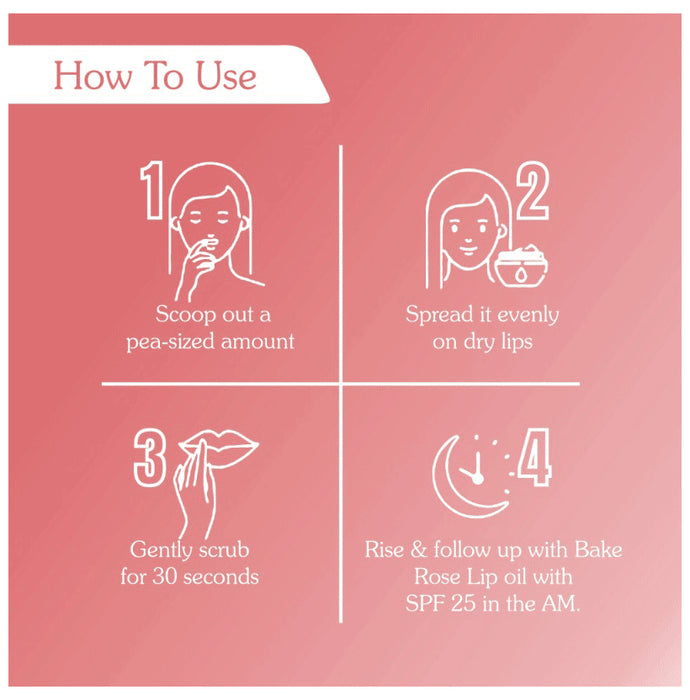 Bake Vitamin C Exfoliating & Lightening Lip Scrub Rose is a luxurious exfoliating and lip brightening treatment, specially formulated to rejuvenate and revitalize your lips. Packed with a powerful combination of sugar granules, shea butter, and delicate rose petals, this scrub offers a gentle yet effective way to achieve soft, supple, and beautifully hydrated lips.Key Ingredients;Jojoba oil, Vitamin C, Sugar Granules, Shea Butter, Sugar granules, Rose petalsKey Benefits: