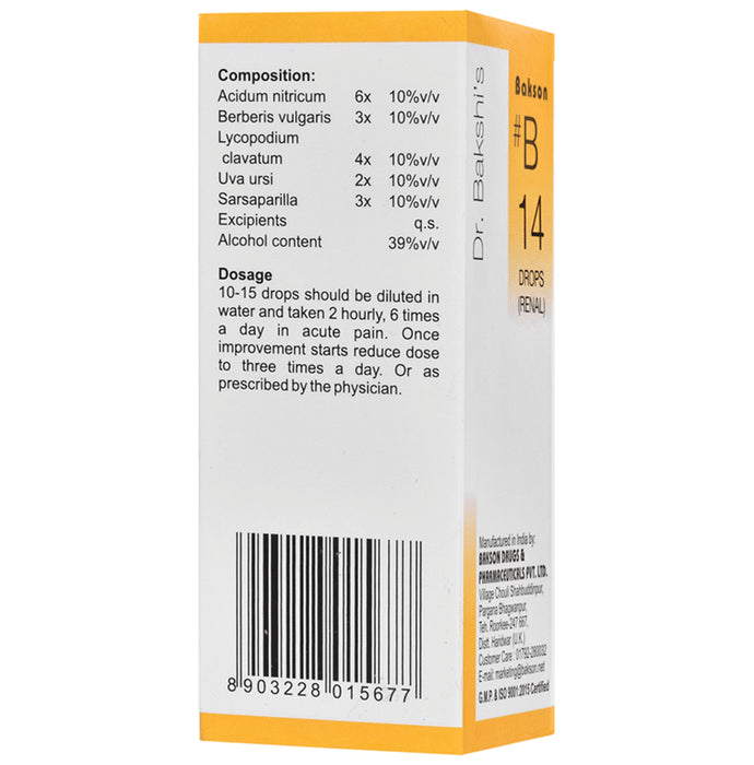 Bakson’s B14 Renal Drops is specifically designed to help alleviate the distress caused by renal calculi. It reduces the discomfort associated with urinary tract infections. It helps relieve kidney pain and combat the presence of oxalic acid in the urine. It can help to eliminate the thick, slimy mucus that may be present in your urine.