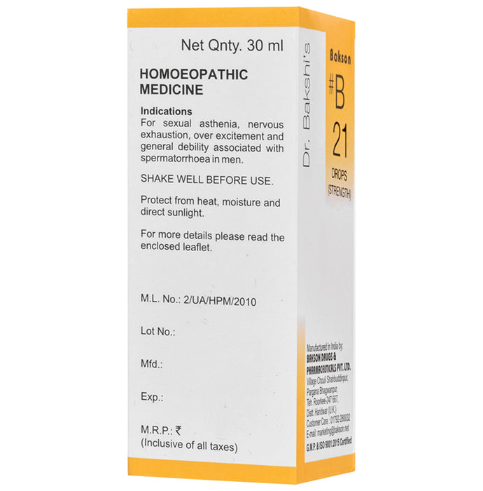 Bakson B21 Strength Drop is a homeopathic solution for sexual wellness. Specially formulated using a unique combination of potent ingredients, this homeopathic solution addresses common concerns faced by men, such as energy loss and the overwhelming fatigue that can undermine your confidence. Bakson's B21 Strength Drop offers a helpful solution to restore your sexual vitality. By promoting healthy blood flow and revitalising your reproductive system, this potent solution helps you achieve stronger health. It helps boost vigour and energy.