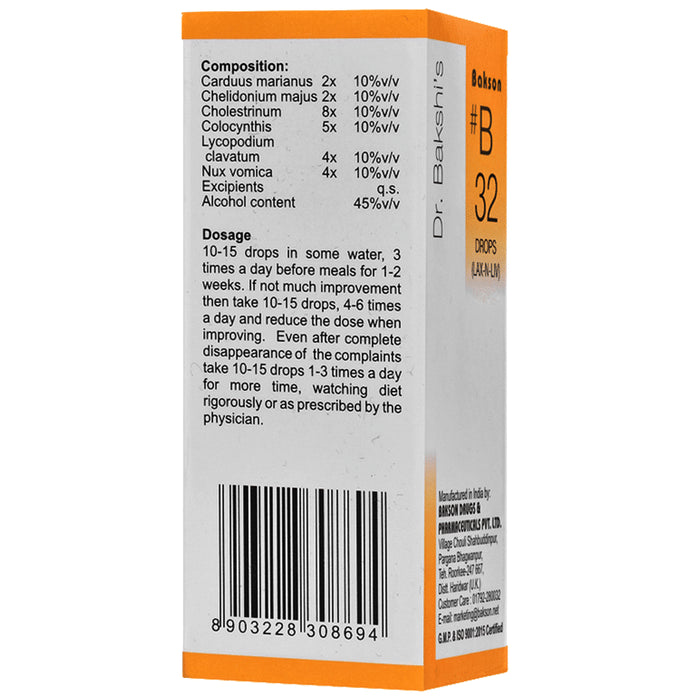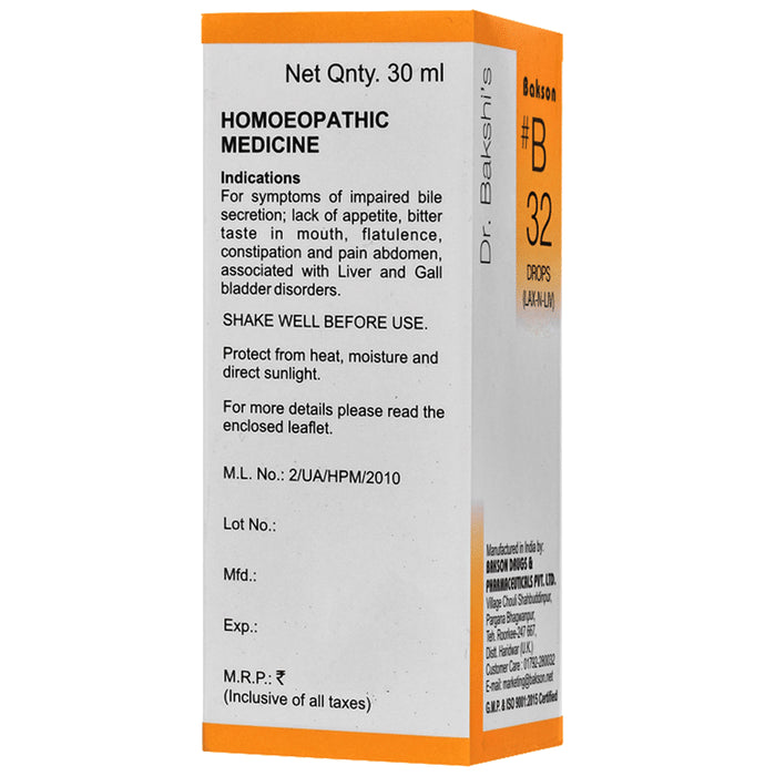 Bakson's B32 Lax-N-Liv Drop helps to stimulate the intestine and regulates bowel movements. It helps to stimulate the intestine and regulates bowel movements. It is also useful in relieving constipation during pregnancy.