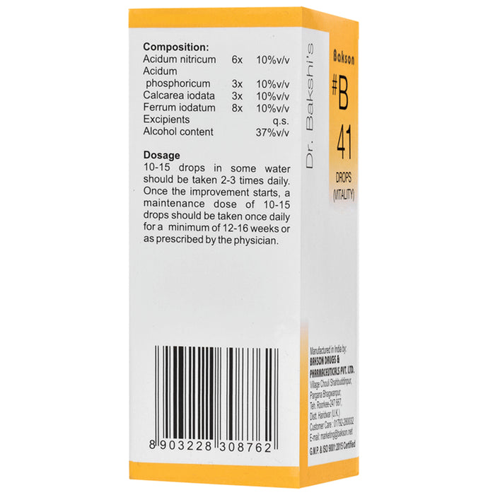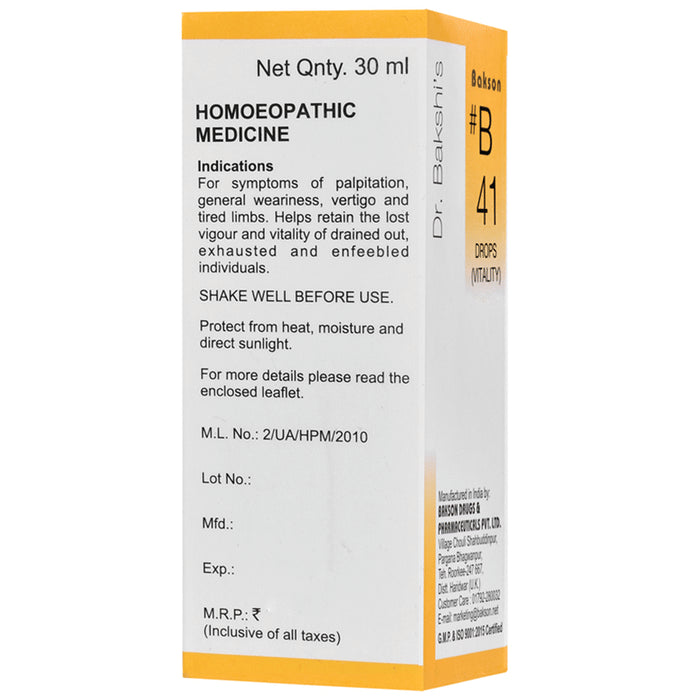 Bakson B41 Vitality Drop is a powerful homoeopathic formulation aimed at helping individuals who are physically drained, mentally exhausted, and feeling weak. This remedy works by addressing various symptoms related to vitality loss, such as palpitations, vertigo, fatigue, and a general sense of weariness. Through its unique blend of homoeopathic ingredients, including Acidum Nitricum, Acidum Phosphoricum, and Calcarea Iodata, this product supports the body's natural ability to regain energy, stamina, and vitality. Suitable for both men and women, it may be beneficial for those suffering from persistent tiredness, lack of energy, or weakness, potentially offering a natural way to restore vigour and well-being. This formulation may be integrated into daily routines to help revitalise the body, reduce weariness, and promote overall vitality.