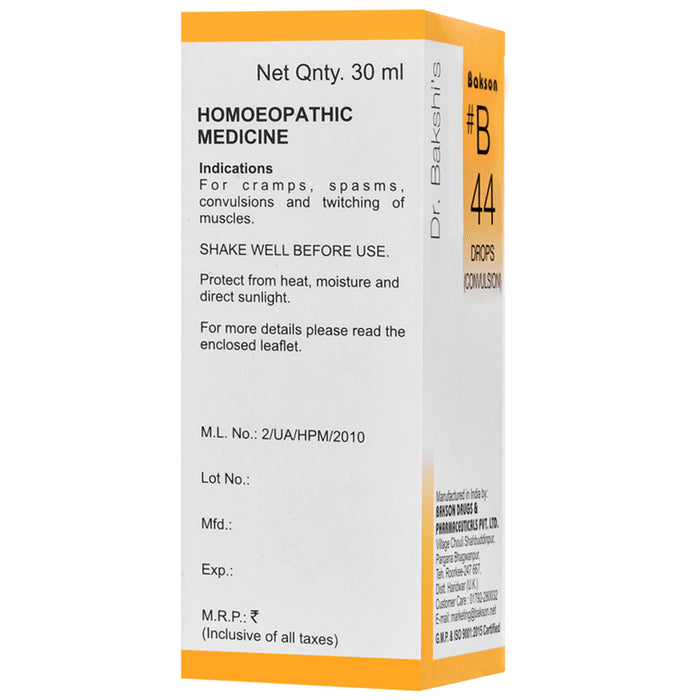 Bakson’s B44 Convulsion Drops is an effective remedy for the treatment of bodily convulsions which are responsible for irregular movements of the body. It involves involuntary contraction of muscles and is associated with brain disorders. It provides effective relief from cramps, epileptic spasms, convulsions and twitching of muscles and helps in restoring normal brain activity.
