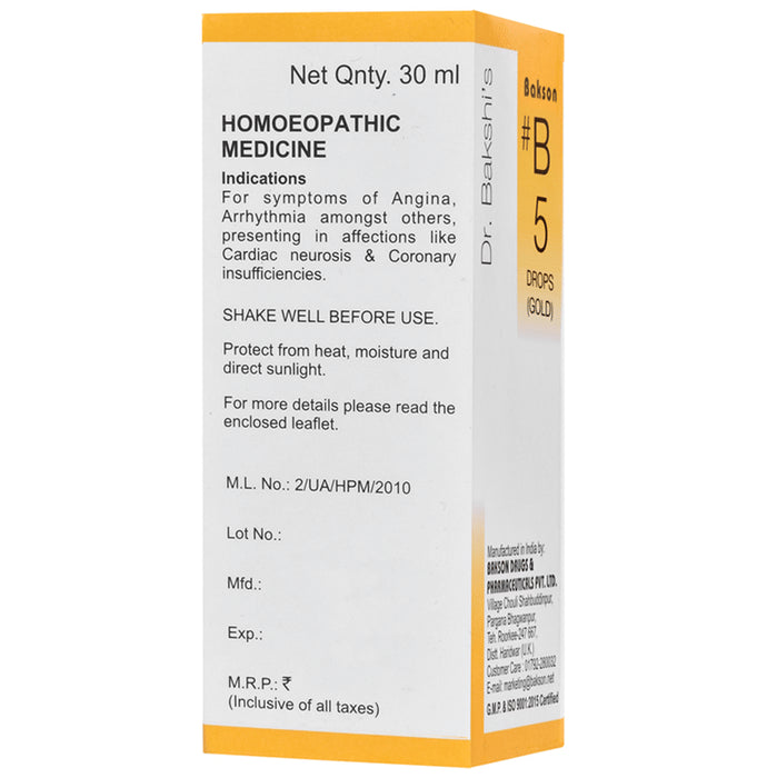 Bakson B5 Gold Drop Bakson B5 Drops offer a safe and natural homoeopathic medicine for heart issues. As a homoeopathic medicine for the heart, Bakson B5 Drops are formulated with natural ingredients that promote the cardiovascular system's overall health. These drops work by improving blood circulation and strengthening the heart muscles, providing relief from various heart issues.Bakson B5 Drops are free from any harmful side effects and can be easily administered by adding a few drops to water or taking them directly under the tongue. If you're looking for homoeopathic medicine for coronary artery disease or other heart-related conditions, Bakson B5 Drops can be a suitable and effective option.In conclusion, Bakson B5 Drops are a natural and safe homoeopathic medicine for heart problems that improve blood circulation and promote a healthy heart. Whether you're seeking homoeopathic medicine for heart issues, homoeopathic medicine for blood circulation, or homoeopathic medicine for a healthy heart, Bakson B5 Drops can be an excellent choice for you.