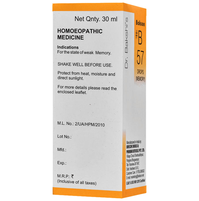 Bakson's B57 Memory Drop is a homeopathic medication useful in managing cases of weak memory, forgetfulness, lack of concentration and effect of fear.
