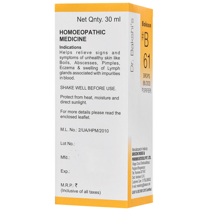 Bakson’s B61 Blood Purifier Drops is an effective remedy to purify the blood of any impurities present in it. Impurities in the blood cause skin problems and it is one of the main reasons for the eruptions of pimples, boils and related skin conditions. Bakson’s B61 Blood Purifier Drops cleanses the blood and eliminates impurities and makes your skin healthy.