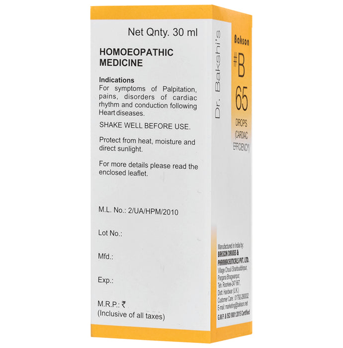Bakson's B65 Cardiac Efficiency Drop is a homeopathic formulation available in the form of drops. The drops are enriched with natural herbs and herbal tinctures that helps to support heart care and health.
