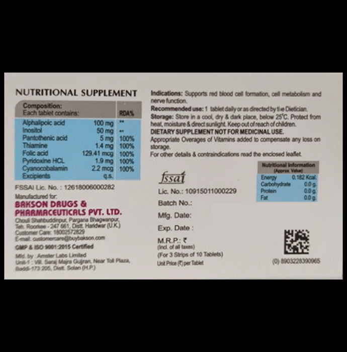 Bakson's B12 Plus Tablets are a dietary supplement that provides important nutrients to help support your overall health. Each tablet contains key ingredients like Alpha Lipoic Acid, Inositol, and Cyanocobalamin, which are known for their roles in maintaining normal body functions. This product can be an easy addition to a balanced lifestyle.