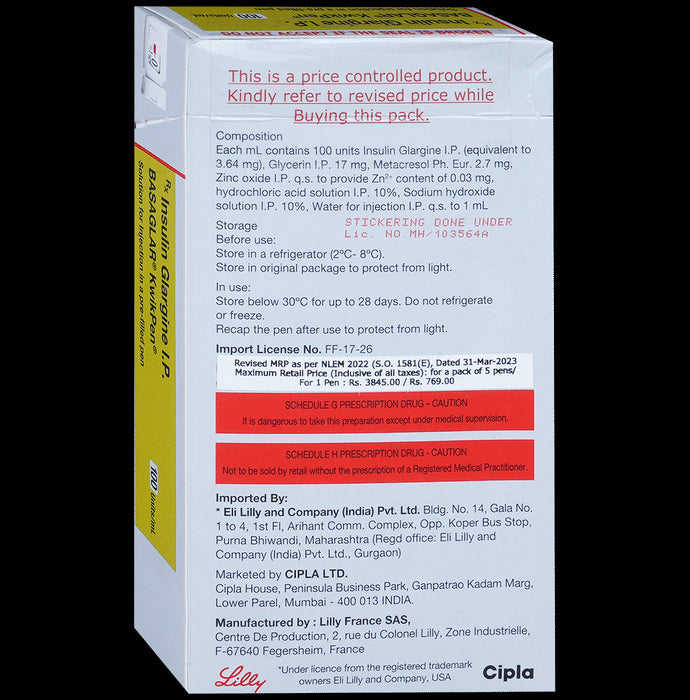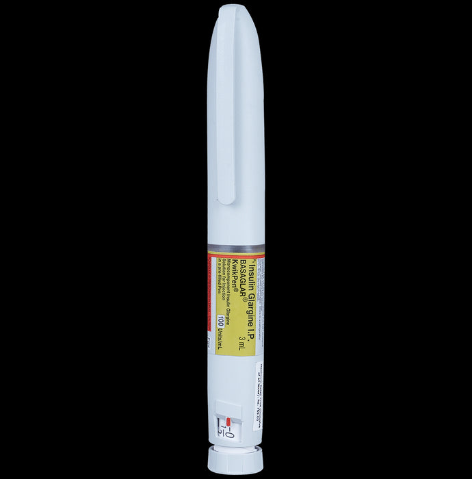 Basaglar 100IU/ml Kwikpen is a long-acting type of insulin used to treat types 1 and 2 diabetes mellitus in both adults and children. It provides a steady level of insulin in the body for an entire day and helps control blood sugar levels. This helps to prevent complications of diabetes. Basaglar 100IU/ml Kwikpen can be prescribed alone or in combination with fast-acting insulin or other diabetes medicines. Your doctor or nurse will teach you how to inject it under the skin correctly. You should use this medicine regularly per the dose advised to get the maximum benefit. If you stop taking it, your blood sugar levels may rise very high, which may put you at risk of serious complications. It is only a part of the treatment program that should include a healthy diet, regular exercise, and weight reduction, as your doctor advises.This medicine's most common side effect is low blood sugar levels (hypoglycemia). To prevent this, it is important to inject only the correct dose of medicine, have regular meals, and monitor your blood sugar levels regularly. Drinking excessive alcohol can also lead to a fall in your blood sugar levels. Other common side effects include peripheral edema, lipodystrophy, allergic reactions, injection site reactions, itching, rashes, and weight gain.Do not use this medicine when you have low blood sugar levels. Before starting the treatment, inform your doctor if you have ever had kidney, liver, or heart problems. Pregnant or breastfeeding women should consult their doctor before using it.