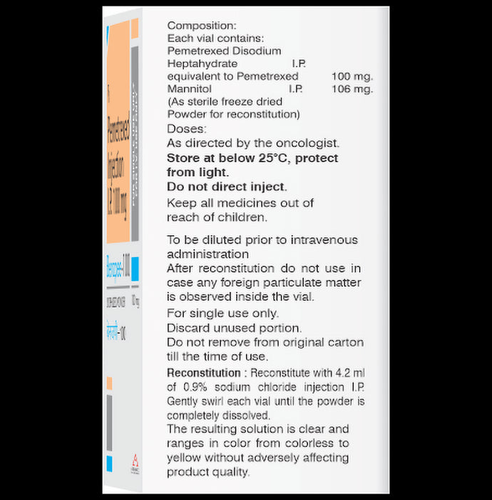 Benzpee 100 Injection is used in the treatment of non-small cell lung cancer and malignant pleural mesothelioma. Benzpee 100 Injection is given as an injection by a qualified medical professional. Your doctor will decide what dose is necessary and how often you need to take it. This will depend on what you are being treated for and may change from time to time. You should take it exactly as your doctor has advised. Taking it in the wrong way or taking too much can cause very serious side effects. It may take several weeks or months for you to see or feel the benefits but do not stop taking it unless your doctor tells you to.The most common side effects of this medicine include nausea, vomiting, loss of appetite, and hair loss. This medicine may reduce the number of blood cells (decrease red blood and white blood cells) in your blood, thereby, increasing the susceptibility to infections. Regular blood tests are required to check your blood cells along with heart, liver and blood uric acid levels.Before taking it, tell your doctor if have heart disease, liver, or kidney problems or are taking any medicines to treat infections. Many other medicines can affect, or be affected by, this medicine so let your doctor know all medications you are using.This medicine is not recommended during pregnancy or while breastfeeding. Use of effective contraception by both males and females during treatment is important to avoid pregnancy.