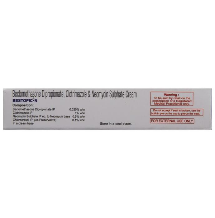 Bestopic N Cream is a combination of three medicines: Beclometasone, Neomycin and Clotrimazole which treat skin infections. Beclometasone is a steroid which blocks the production of certain chemical messengers (prostaglandins) that make the skin red, swollen and itchy. Neomycin is an antibiotic which stops the growth of bacteria while Clotrimazole is an antifungal which stops the growth of fungi on the skin. Together, they treat your skin infection effectively.