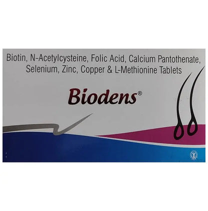 Biodens Tablet is a dietary supplement that can be used to manage hair fall and hair thinning-related concerns. It can help increase hair volume and prevents hair thinning. This tablet also contains essential vitamins and minerals which can improve overall health, improve immunity, and prevents fatigue and lethargy. Ingredients: Biotin|Calcium pantothenate|L-arginine|L-Cysteine|L-Lysine|Niacinamide|Para-Aminobenzoic Acid|Zinc Sulphate|DL methionine|Inositol|Selenium|Iron|Copper Benefits: Biotin can help reduce hair loss, brittle nails, and skin rashes in infants|The tablet can help alleviate sinus infection, nasal dryness, and skin irritation|L-Arginine is an amino acid that may stimulate the release of insulin, growth hormones, and other substances in the body|Iron transports oxygen throughout the body and manages the haemoglobin production of red blood cells, thus boosting immunity and managing anaemia Direction of use: As directed by the healthcare professional. Uses: Reduces hair fall|Alleviate skin and nasal dryness|Maintains overall health