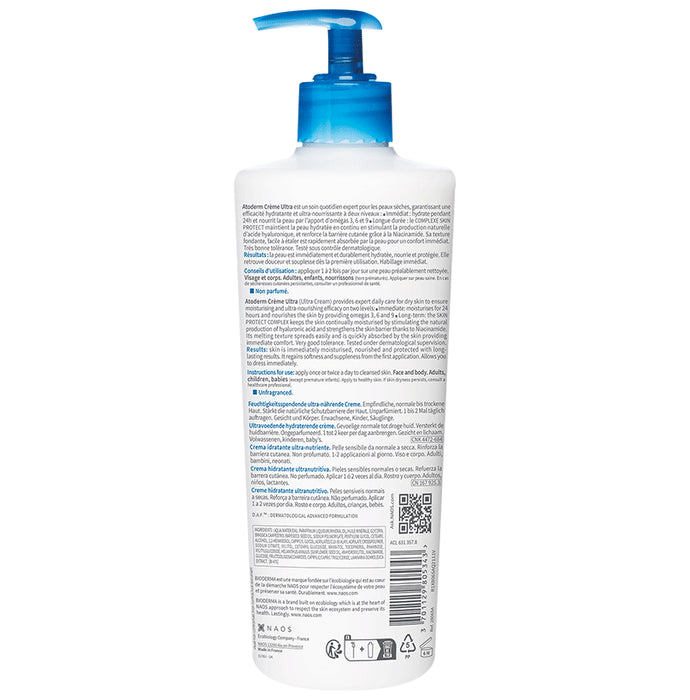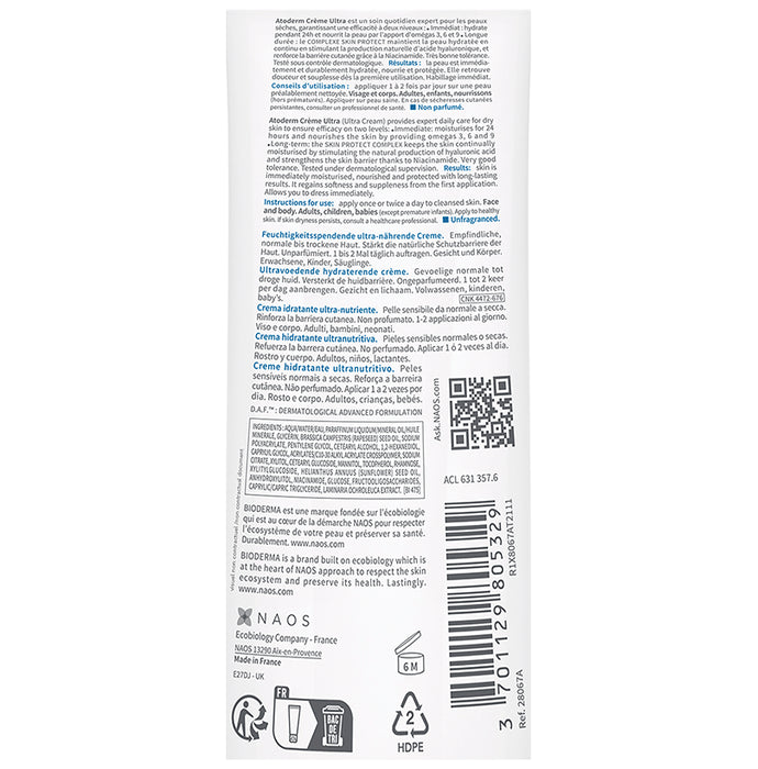 Bioderma Atoderm Ultra-Nourishing Cream helps repair, soothe, and protect the skin. The Skin Protect Complex containing vitamin PP and a combination of two sugar, physically and biologically, recreates a healthy skin barrier and helps maintain the skin’s moisture level. The combination of sugars optimises the skin’s water reserves and facilitates the hydric flow through the skin’s layers by increasing the synthesis of aquaporins (water channels). This provides deep hydration for up to 24 hours and stimulates hyaluronic acid synthesis. The presence of glycerine and fatty mineral substance in the cream helps increase skin hydration. The D.A.F. patented natural complex increases the skin’s tolerance threshold.