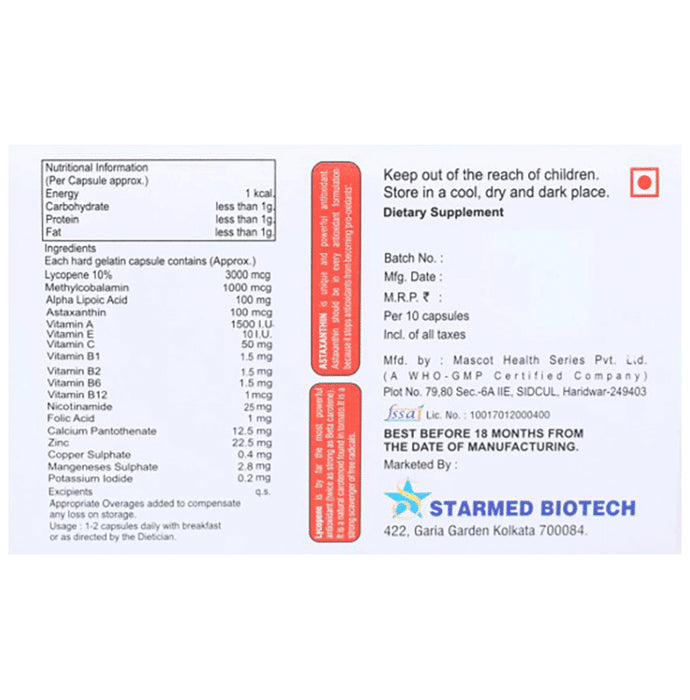 Composition : Lycopene 10%, Methylcobalamine, Alpha Lipoic Acid,Vitamin A, Vitamin C, Vitamin E, Vitamin B1, Vitamin B2, Vitamin B6, Vitamin B12, Nicotinamide, Folic acid, Calcium pantothenate, Zinc, Copper, Potassium, Manganese