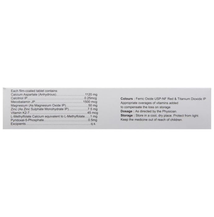 Composition : Calcium Aspartate (Anhydrous) 1120 mg|Calcitriol IP 0.25 mcg|Mecobalamin JP |Magnesium |Zinc|Vitamin K2-7|L-Methylfolate |Pyridoxal-5-Phosphate