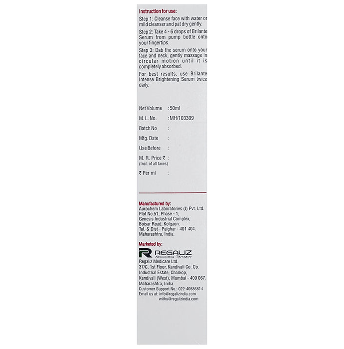 Brilante Intense Brightening Serum is a dermatologically tested intense serum with direct delivery depigmenting therapy. It is a highly concentrated, quicker-acting formula. It helps to reduce dark spots and manage uneven skin tone. Key IngredientsPurified Water, Polyacrylate-13, Polyisobutene, Polysorbate 20, Diethylene Glycol Mono ethyl ether, Alpha Arbutin, Licorice Extract 40% CA, 4-n-butylresorcinol, Allantoin, Acetylated Lanoline Alcohol, Imidazolidinyl Urea, Di Sodium EDTA, Propanediol, Benzyl Alcohol, Fragrance.Key BenefitsIt helps in reducing dark spots and maintaining even skin toneFacilitates faster absorption and deeper penetration into the skinHighly effective skin glowing serum with anti-ageing benefitsPotent inhibitor of melanin synthesis and is used to restore an even skin toneGood to Know:Dermatologically tested and trusted formulaFree from parabens, colour additives, allergens and sulphatesNon-comedogenic and hypoallergenicIdeal For:Men/WomenProduct Form:Serum.Container Type:Pump bottle.Area of ApplicationFace and neck.ConcernIt provides depigmenting therapy and manages dark spots, uneven skin tone, and glowing skin.Directions for UseCleanse face with water or mild cleanser and gently pat dryTake 4 to 6 drops of Brilante serum and dab the serum onto your face and neckGently massage in a circular motion until it is completely absorbedSafety InformationRead the label carefully before useDo not exceed the recommended doseKeep out of the reach of childrenStore at a temperature below 25-degree Celsius and 40 % humidity in a cool and dry placeShould be protected from direct light