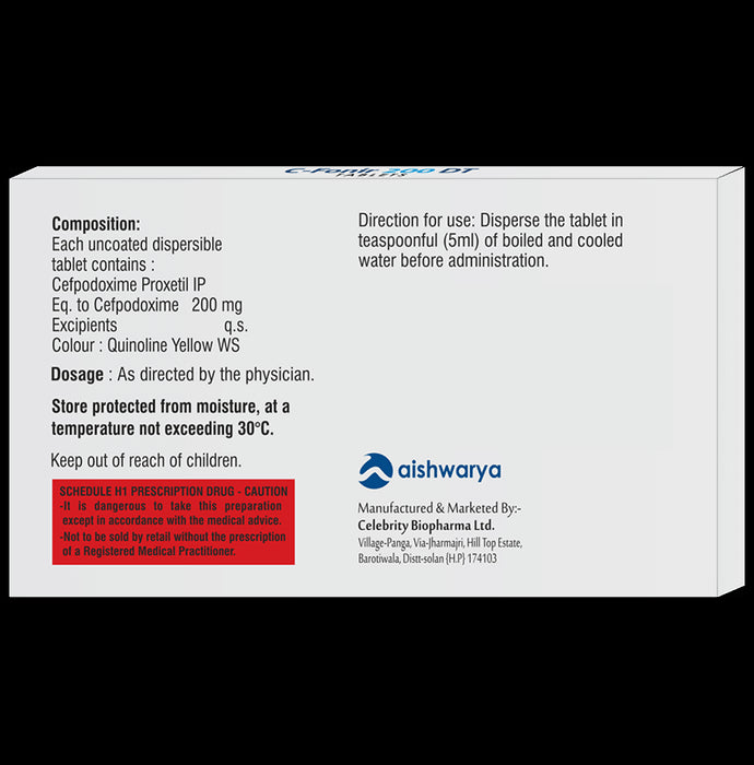 C-Fonir 200 DT Tablet is an antibiotic medicine used to treat bacterial infections in your body. It is effective in infections of the lungs (eg. pneumonia), urinary tract, ear, nasal sinus, throat, and skin. It kills bacteria, which helps to improve your symptoms and cure the infection. C-Fonir 200 DT Tablet should be taken with food. You should take it regularly at evenly spaced intervals as per the schedule prescribed by your doctor. Taking it at the same time every day will help you to remember to take it. The dose will depend on what you are being treated for, but you should always complete a full course of this antibiotic as prescribed by your doctor. Do not stop taking it until you have finished, even when you feel better. If you stop taking it early, some bacteria may survive and the infection may come back. It will not work for viral infections such as flu or the common cold. Using any antibiotic when you do not need it can make it less effective for future infections.The most common side effects of this medicine include rash, nausea, and diarrhea. Taking this medicine along with some food may help to prevent indigestion and upset stomach. Consult your doctor if you find these side effects bother or worry you. Before using it, you should tell your doctor if you are allergic to any antibiotics or have any kidney or liver problems. This medicine is generally regarded as safe to use in pregnancy and breastfeeding if prescribed by your doctor. It may blur your vision or make you feel sleepy and dizzy. Do not drive if these symptoms occur.
