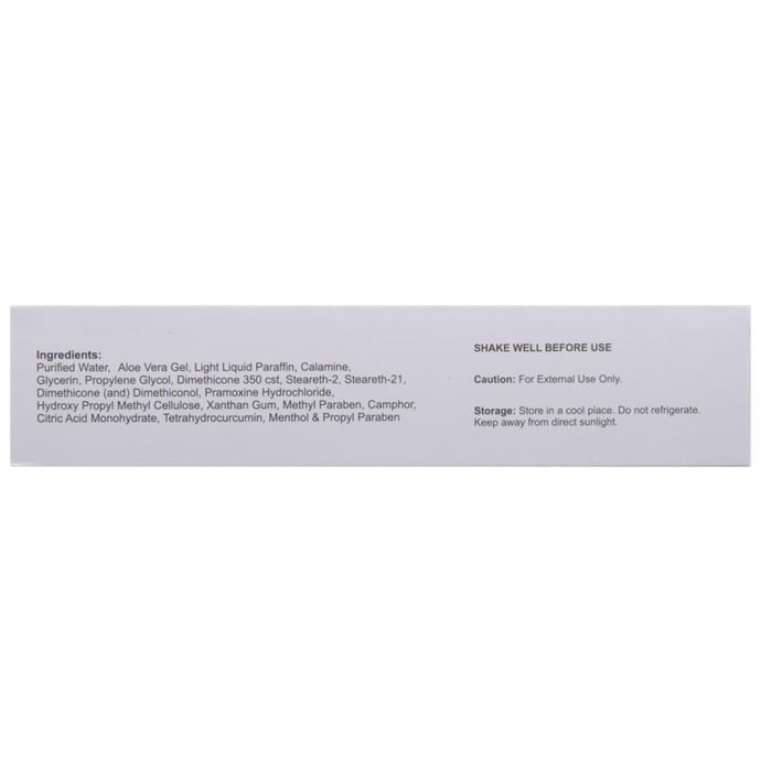 Composition : Purified Water, Aloe Vera Gel, Light Liquid Paraffin, Calamine, Glycerin, Propylene Glycol, Dimethicone 350 cst, Steareth-2, Steareth-21, Dimethicone (and) Dimethiconol, Pramoxine Hydrochloride, Hydroxy Propyl Methyl Cellulose, Xanthan Gum, Methyl Paraben, Camphor, Citric Acid Monohydrate, Tetrahydrocurcumin, Menthol & Propyl Paraben
