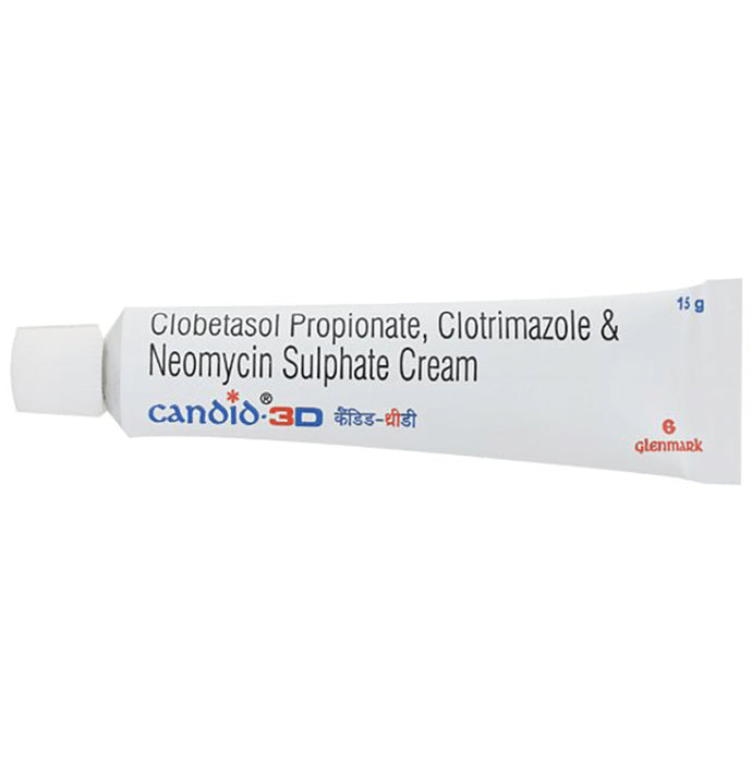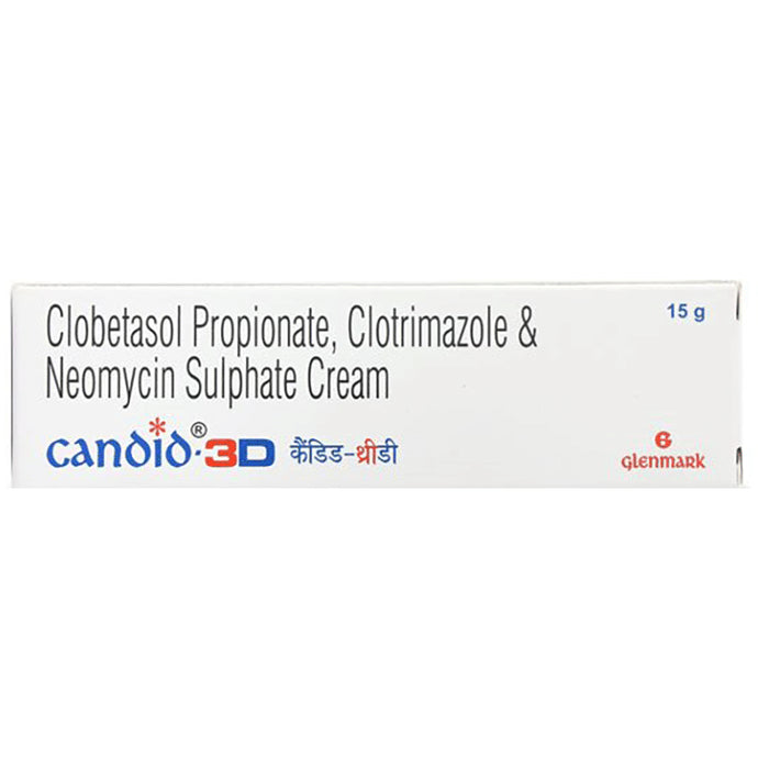 Candid 3D Cream is a combination of three medicines: Clotrimazole, Clobetasol and Neomycin, which treats skin infections. Clotrimazole is an antifungal which stops the growth of fungi by preventing them from forming their own protective covering. Clobetasol is a steroid medicine. It blocks the production of certain chemical messengers (prostaglandins) that make the skin red, swollen and itchy. Neomycin is an antibiotic. It stops bacterial growth by preventing the synthesis of essential proteins required by the bacteria to carry out vital functions.